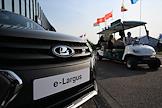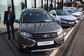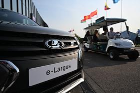 XXVI Петербургский международный экономический форум (ПМЭФ) 2023 в конгрессно-выставочном центре (КВЦ) "Экспофорум". Жанровая фотография. Автомобиль бренда LADA ("Лада") АО "АВТОВАЗ" - электромобиль LADA e-Largus.