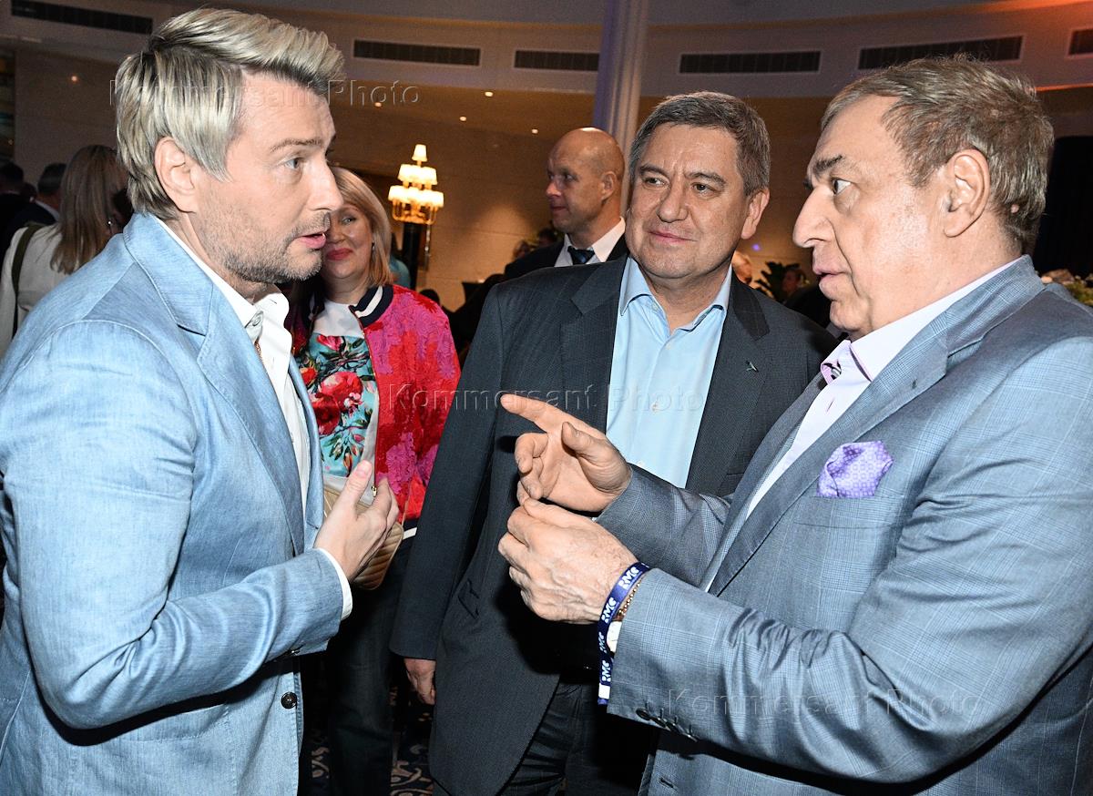 XXVI Петербургский международный экономический форум (ПМЭФ) 2023. Welcome party от "Русской медиагруппы" в отеле Lotte в ресторане The Lounge. Председатель совета директоров АО НК "РуссНефть", поэт Михаил Гуцериев (в центре) и певец Николай Басков (слева) на мероприятии.