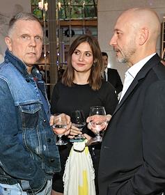 XXVI Петербургский международный экономический форум (ПМЭФ) 2023. Welcome party от "Русской медиагруппы" в отеле Lotte в ресторане The Lounge. Генеральный директор АО "Коммерсантъ", главный редактор газеты "Коммерсантъ" Владимир Желонкин (справа), специальный корреспондент ИД "Коммерсантъ" Андрей Колесников (слева) и его супруга Дарья (в центре) на мероприятии.