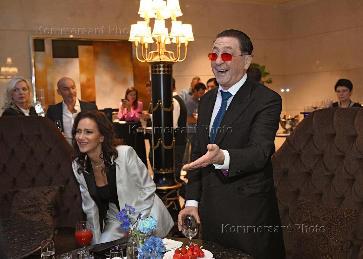 XXVI Петербургский международный экономический форум (ПМЭФ) 2023. Welcome party от "Русской медиагруппы" в отеле Lotte в ресторане The Lounge. Генеральный продюсер кинокомпании "Русский север", певица Елена Север (слева) и певец Григорий Лепс (справа) на мероприятии.