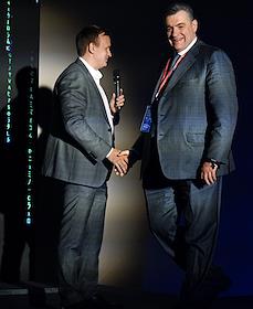 XXVI Петербургский международный экономический форум (ПМЭФ) 2023. Презентация нейросети "Жириновский". Запуск первого политического алгоритма. Председатель партии Либерально-демократическая партия России (ЛДПР) Леонид Слуцкий (слева) и куратор проекта, первый заместитель председателя комитета Государственной думы России по строительству и жилищно-коммунальному хозяйству Владимир Кошелев (справа) во время презентации.