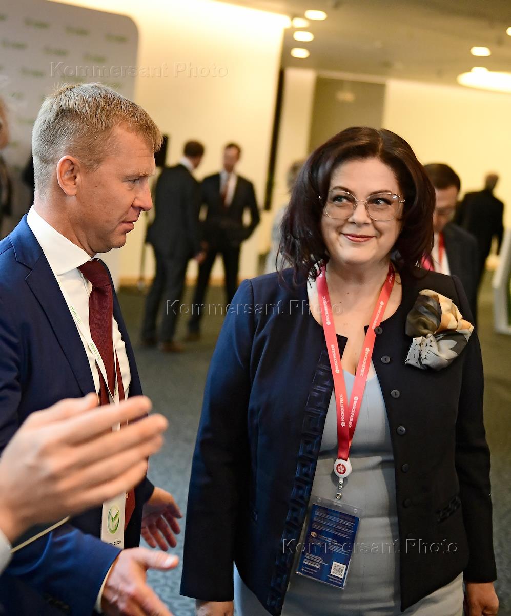 XXVI Петербургский международный экономический форум (ПМЭФ) 2023. Деловой завтрак Сбера в отеле Airoportcity Plaza. Вице-президент Торгово-промышленной палаты (ТПП) России Елена Дыбова (справа) и член правления, заместитель председателя правления Сбербанка, руководитель блока "Корпоративно-инвестиционный бизнес" Анатолий Попов (слева) перед началом завтрака.