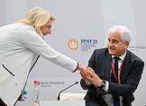 XXVI Петербургский международный экономический форум (ПМЭФ) 2023 в конгрессно-выставочном центре (КВЦ) "Экспофорум". Сессия "Диалоги культур в эпоху глобальных изменений". Член совета директоров - независимый директор ПАО "Роснефть", бывший министр иностранных дел Австрии Карин Кнайсль (слева) и художественный руководитель Фонда "Талант и успех" Ханс-Йоахим Фрай (справа) перед началом сессии.