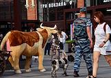 Views of Moscow. Gastro-quarter "Three stations. Depot". Genre photography. An employee of the cynological service of the police with a dog on the territory of the gastro quarter.