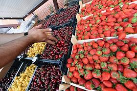 Gastro-quarter "Three stations. Depot". Genre photography. Trade in fruits and berries at the bazaar of the gastro quarter. A counter with strawberries and cherries.