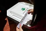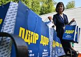 78-я внеочередная конференция Московского городского отделения ЛДПР, на которой будет принято решение о выдвижении кандидата от партии на предстоящих в сентябре выборах мэра Москвы, в летнем кинотеатре парка Фили. Жанровая фотография. Урна для голосования участников конференции.