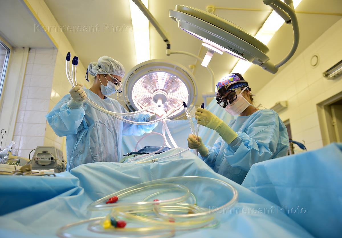 Работа Национального медицинского исследовательского центр имени академика Е. Н. Мешалкина. Экспериментальная операция по имплантации протеза легочной артерии свиньи. Жанровая фотография. Подготовка к операции.