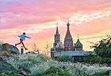 Виды Москвы. Жанровая фотография. Спасская башня Кремля и купола Храма Василия Блаженного со стороны парка "Зарядье".