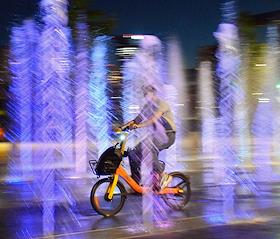Жанровая фотография. Мужчина едет на велосипеде у фонтана.