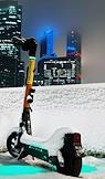 Виды Москвы после снегопада. Жанровая фотография. Заснеженный электросамокат на фоне башен Московского международного делового центре "Москва-Сити".