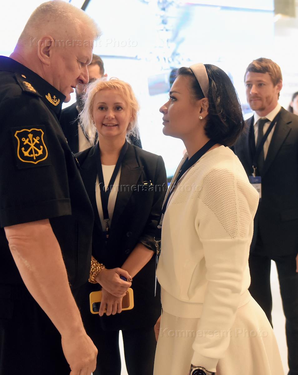 Международный военно-морской салон в Кронштадте на территории туристско-рекреационного кластера "Остров Фортов". Главнокомандующий Военно-Морским Флотом России Николай Евменов (слева) и руководитель проектного офиса по созданию туристско-рекреационного кластера АНО "Остров фортов" Ксения Шойгу (справа) во время работы салона.