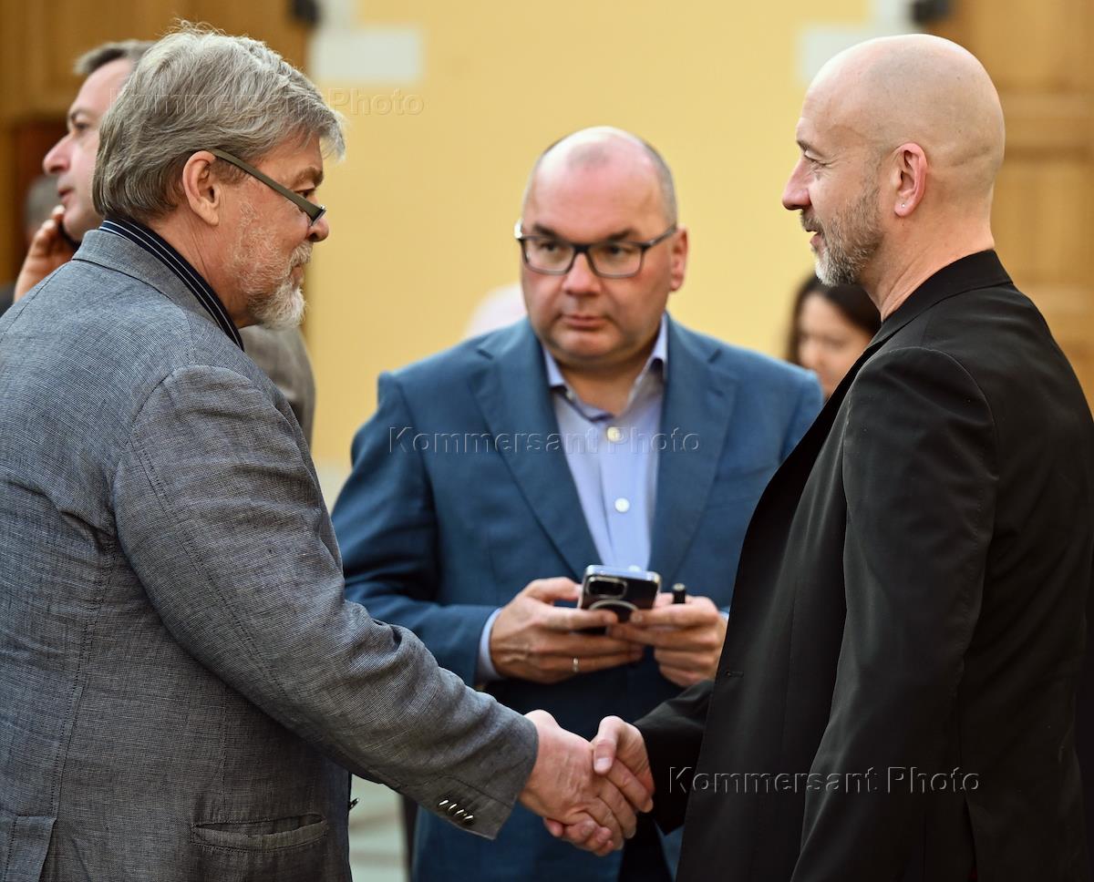Opening ceremony of the exhibition and presentation of Mikhail Seslavinsky's album "The Book World of Alexander Benois", dedicated to the 125th anniversary of the creative association "World of Art" at the Pushkin State Museum on Prechistenka. From left to right: Konstantin Remchukov, owner and editor-in-chief of Nezavisimaya Gazeta, Sergey Mikhailov, CEO of the Russian news agency TASS, and Vladimir Zhelonkin, CEO of Kommersant, editor-in-chief of the Kommersant newspaper, before the ceremony.
