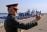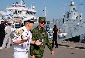XI Международный военно-морской салон "МВМС-2023" в Музее военно-морской славы и Конгрессно-выставочном центре, расположенных на территории туристско-рекреационного кластера "Остров фортов". Жанровая фотография. Зона демонстрации кораблей у причала акватории Средней гавани.