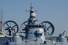 XI Международный военно-морской салон "МВМС-2023" в Музее военно-морской славы и Конгрессно-выставочном центре, расположенных на территории туристско-рекреационного кластера "Остров фортов". Жанровая фотография. Зона демонстрации кораблей у причала акватории Средней гавани. Корабль на воздушной подушке "Мордовия".