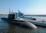 XI Международный военно-морской салон "МВМС-2023" в Музее военно-морской славы и Конгрессно-выставочном центре, расположенных на территории туристско-рекреационного кластера "Остров фортов". Жанровая фотография. Зона демонстрации кораблей у причала акватории Средней гавани. Корабль на воздушной подушке "Мордовия" и подводная лодка "Уфа".