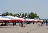 XI Международный военно-морской салон "МВМС-2023". Жанровая фотография. Вылет самолетов МиГ-29 пилотажной группы "Стрижи" с аэродрома Ленинградской армии ВВС и ПВО в поселке Левашово для показательных выступлений на "МВМС-2023" в Кронштадте.