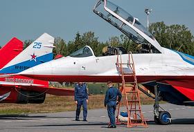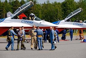 XI Международный военно-морской салон "МВМС-2023". Жанровая фотография. Подготовка самолетов МиГ-29 пилотажной группы "Стрижи" на аэродроме Ленинградской армии ВВС и ПВО в поселке Левашово перед вылетом для показательных выступлений на "МВМС-2023" в Кронштадте.