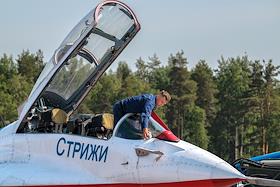 XI Международный военно-морской салон "МВМС-2023". Жанровая фотография. Техническое обслуживание и пилоты самолетов МиГ-29 пилотажной группы "Стрижи" на аэродроме Ленинградской армии ВВС и ПВО в поселке Левашово после показательных выступлений на "МВМС-2023" в Кронштадте.