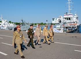 XI Международный военно-морской салон "МВМС-2023" в Музее военно-морской славы и Конгрессно-выставочном центре, расположенных на территории туристско-рекреационного кластера "Остров фортов". Министр промышленности и торговли Российской Федерации Денис Мантуров (в центре) на МВМС-2023.