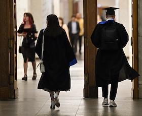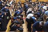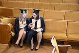 Церемония вручения дипломов с отличием выпускникам Московского государственного университета (МГУ) имени М.В.Ломоносова в главном здании МГУ. Жанровая фотография. Выпускники перед началом церемонии.