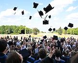 Церемония вручения дипломов с отличием выпускникам Московского государственного университета (МГУ) имени М.В.Ломоносова в главном здании МГУ. Жанровая фотография. Выпускники бросают вверх головной убор бакалавра после церемонии у здания университета.