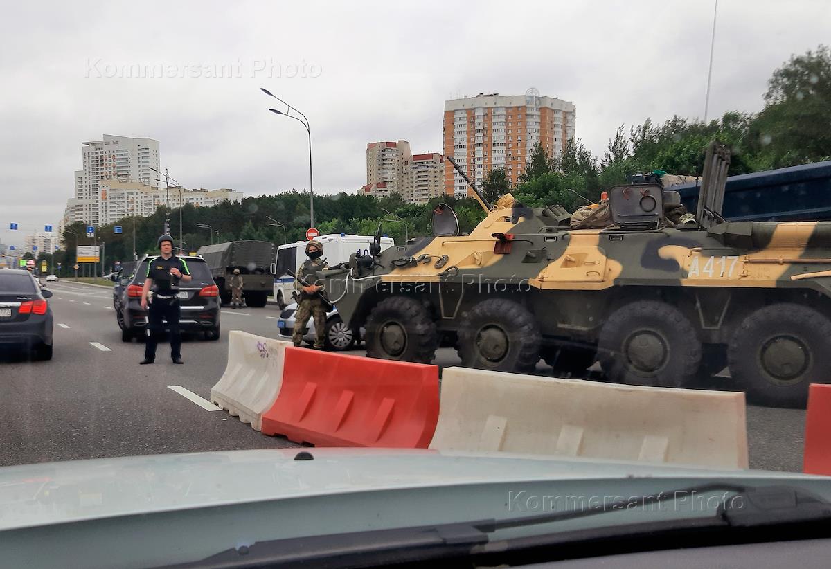 The situation in Moscow during the regime of the counter-terrorist operation (CTO). Military equipment at the exit from the Moscow Ring Road in Yasenevo.