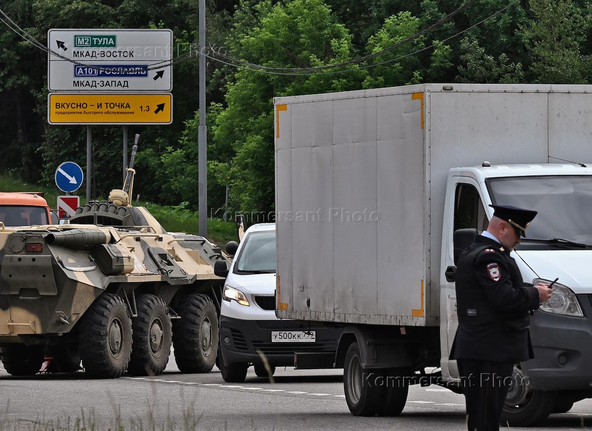 The situation in Moscow during the regime of the counter-terrorist operation (CTO). Military equipment at the exit from the Moscow Ring Road in Yasenevo.
