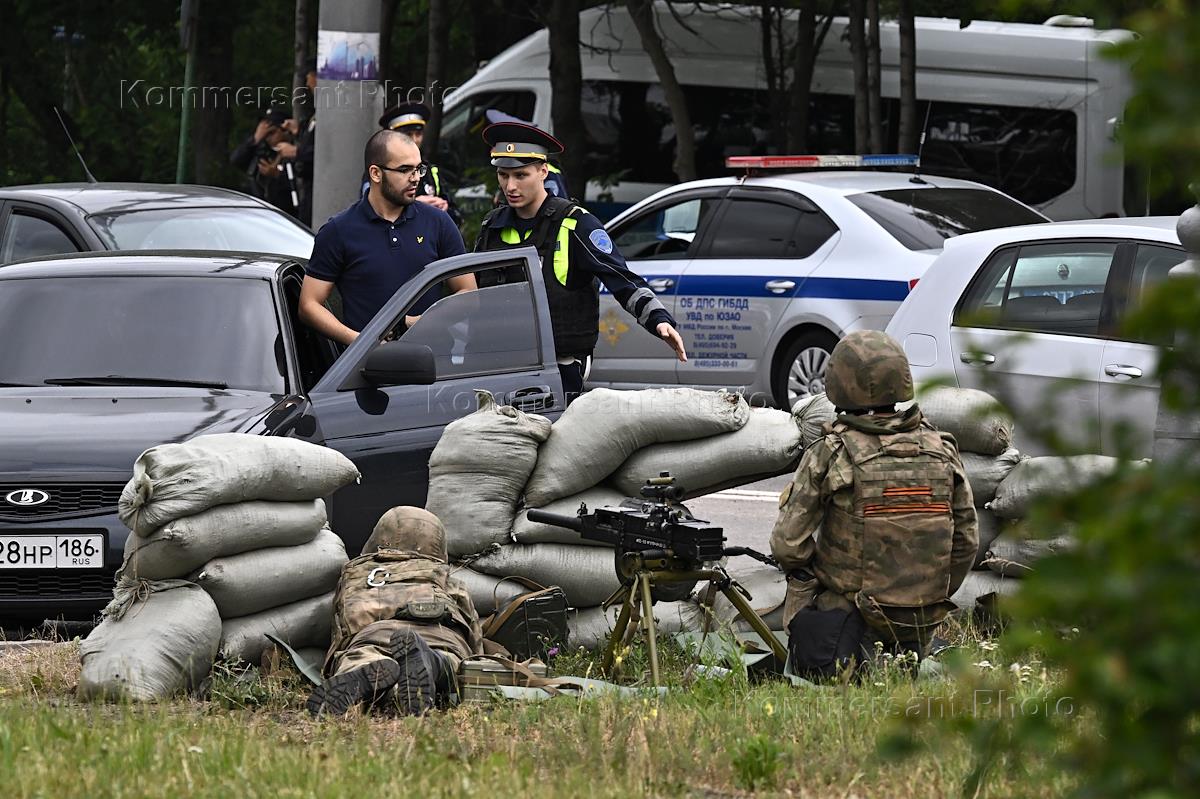 Обстановка в Москве во время режима контртеррористической операции (КТО). Сотрудник полиции во время проверки документов у водителя и военнослужащий на стрелковой позиции из мешков с песком на съезде с МКАД в Ясенево.