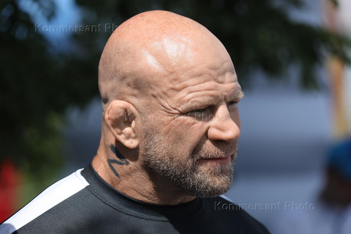 Молодежный фестиваль "Три Четыре" в рамках празднования Дня молодежи на Центральной набережной. Американский борец по смешанным боевым искусствам Джеффи Монсон во время спортивной разминки с участниками фестиваля на верхней террасе набережной.