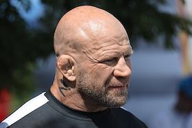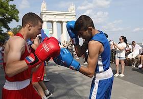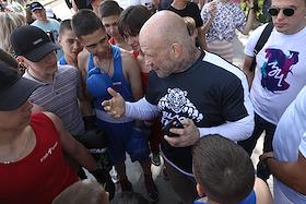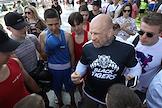 Молодежный фестиваль "Три Четыре" в рамках празднования Дня молодежи на Центральной набережной. Американский борец по смешанным боевым искусствам Джеффи Монсон во время спортивной разминки с участниками фестиваля на верхней террасе набережной.
