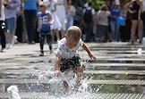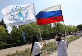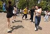 Молодежный фестиваль "Три Четыре" в рамках празднования Дня молодежи на Центральной набережной. Участники фестиваля во время спортивной разминки на верхней террасе набережной.