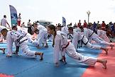 Молодежный фестиваль "Три Четыре" в рамках празднования Дня молодежи на Центральной набережной. Американский борец по смешанным боевым искусствам Джеффи Монсон (в центре) во время спортивной разминки с участниками фестиваля на верхней террасе набережной.