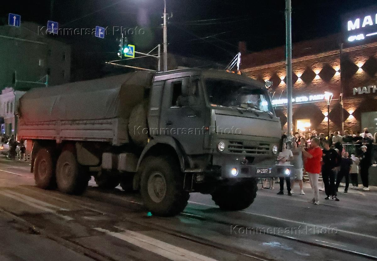 Обстановка в Ростове-на-Дону после объявления об уходе бойцов ЧВК "Вагнер". Военная техника и автомобили на улице города.