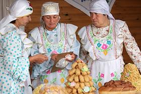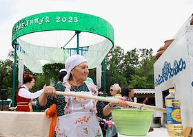 Национальный ежегодный татаро-башкирский праздник "Сабантуй" в жилом массиве Мирный в Казани. Жанровая фотография. Павильон с национальными мучными блюдами.