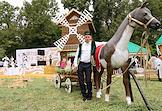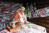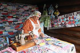 Национальный ежегодный татаро-башкирский праздник "Сабантуй" в жилом массиве Мирный в Казани. Жанровая фотография. Павильон рукоделия на празднике. Женщина демонстрируем технику лоскутного шитья.