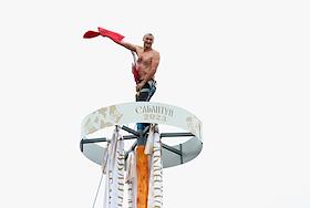 Национальный ежегодный татаро-башкирский праздник "Сабантуй" в жилом массиве Мирный в Казани. Жанровая фотография. Участник аттракциона на столбе с призом.