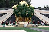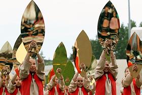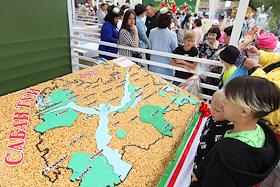 Национальный ежегодный татаро-башкирский праздник "Сабантуй" в жилом массиве Мирный в Казани. Жанровая фотография. Карта Республики Татарстан, изготовленная из национального кондитерского угощения Чак-чак. Зрители праздника.