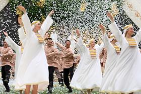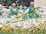 Национальный ежегодный татаро-башкирский праздник "Сабантуй" в жилом массиве Мирный в Казани. Жанровая фотография. Выступление национального танцевального ансамбля.