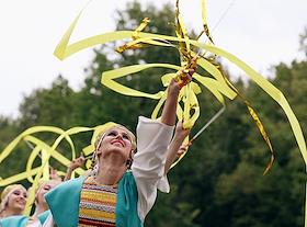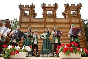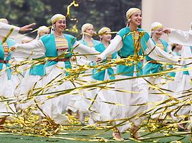 Национальный ежегодный татаро-башкирский праздник "Сабантуй" в жилом массиве Мирный в Казани. Выступление национального танцевального ансамбля.