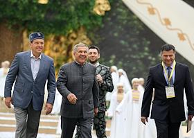 Национальный ежегодный татаро-башкирский праздник "Сабантуй" в жилом массиве Мирный в Казани. Глава Республики Татарстан Рустам Минниханов (слева) у павильона кожевенного производства.