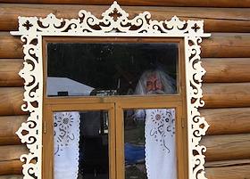 Национальный ежегодный татаро-башкирский праздник "Сабантуй" в жилом массиве Мирный в Казани. Жанровая фотография. Пожилой мужчина у окна дома с резными наличниками.