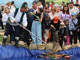 Национальный ежегодный татаро-башкирский праздник "Сабантуй" в жилом массиве Мирный в Казани. Жанровая фотография. Участники праздника - дети ловят руками живую рыбу из бассейна.