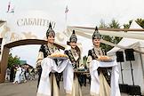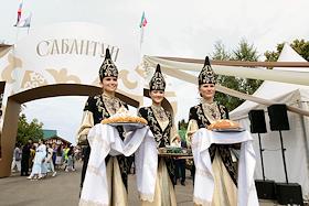 Национальный ежегодный татаро-башкирский праздник "Сабантуй" в жилом массиве Мирный в Казани. Жанровая фотография. Девушки в национальных костюмах с угощением на празднике.