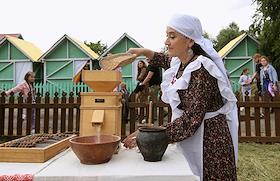 Национальный ежегодный татаро-башкирский праздник "Сабантуй" в жилом массиве Мирный в Казани. Жанровая фотография. Павильон ремесел. Женщина молит муку из зерен пшеницы.