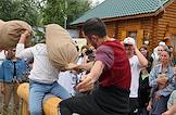 Национальный ежегодный татаро-башкирский праздник "Сабантуй" в жилом массиве Мирный в Казани. Жанровая фотография. Национальное соревнование "Бой на мешках". Мужчины сидят на бревне во время соревнования.