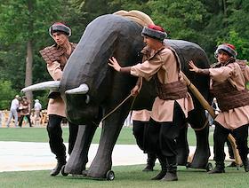Национальный ежегодный татаро-башкирский праздник "Сабантуй" в жилом массиве Мирный в Казани. Жанровая фотография. Выступление артистов на джамперах на празднике.