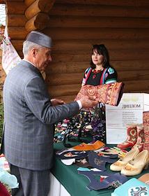 Национальный ежегодный татаро-башкирский праздник "Сабантуй" в жилом массиве Мирный в Казани. Жанровая фотография. Павильон народных промыслов. Женщина показывает зрителям плетение из ниток.