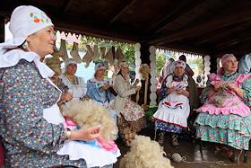 Национальный ежегодный татаро-башкирский праздник "Сабантуй" в жилом массиве Мирный в Казани. Жанровая фотография. Павильон народных промыслов. Женщины прядут овечью шесть и вяжут на спицах.