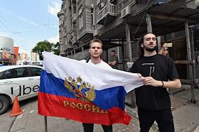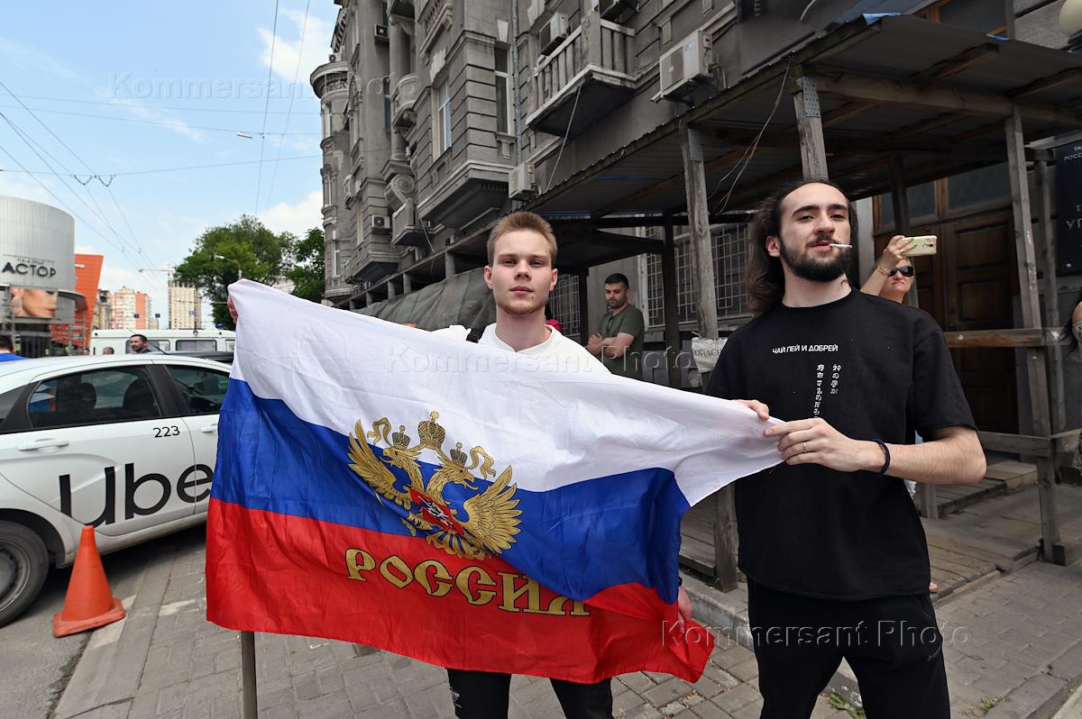 Ситуация в Ростове-на-Дону. Местные жители с Государственным Флагом России на улице города.