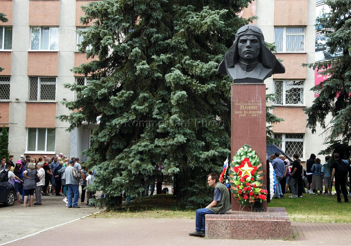 Церемония отправки призывников на срочную службу от военкомата Советского района. Жанровая фотография. Призывники и их родственники у бюста героя Советского Союза, летчика Бориса Панина.